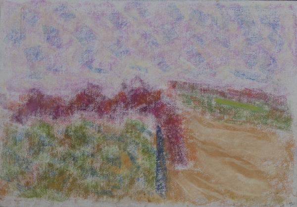 - NOTIZIE STORICO CRITICHE Congdon affianca alla produzione dei dipinti le prime opere a pastello all'inizio degli anni Ottanta. Le prime prove, come in questo caso, risentono ancora di una visione di tipo naturalistico: il paesaggio rurale, che egli osserva della finestra del suo studio alla Cascinazza come tra le montagne di Subiaco, viene restituito in maniera sintetica e allo stesso tempo estremamente narrativa. Compaiono una serie di elementi che rimangono come imprescindibili punti di riferimento: il campo che si incunea verso al linea dell'orizzonte, il filare di alberi che separa la terra dal cielo e il segno scuro del canale sulla destra che fiancheggia il campo, la montagna che chiude la vista della valle dell'Aniene.