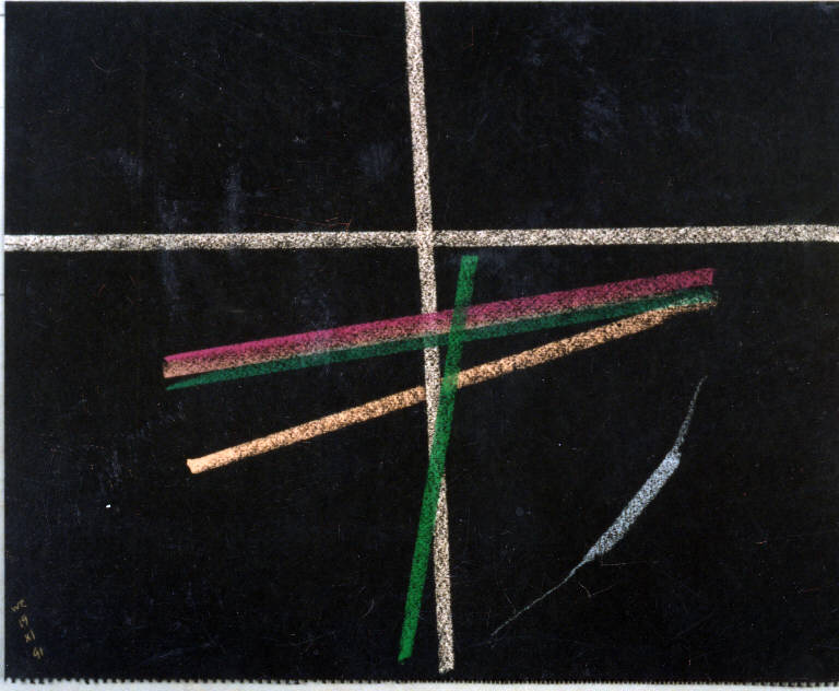 - NOTIZIE STORICO CRITICHE L'osservazione inesausta e quotidiana del paesaggio antistante lo studio trova nei pastelli, rispetto alla pittura, una via rappresentativa del tutto particolare. Gli elementi del paesaggio vengono infatti ridotti all'estremo fino a portare la composizione ad un'apparente astrazione. Tuttavia è possibile riconoscere quegli stessi elementi che caratterizzano i paesaggio della Bassa milanese anche più descrittivi: cielo, terra, canale e filare di alberi. Questi elementi chiave vengono riassunti in un solo segno che diventa la traccia luminosa di ciò che rappresenta. Il resto della composizione, il senso spaziale e atmosferico della stessa, è affidato al colore del supporto stesso che viene ravvivato dai segni ortogonali, curvi o obliqui che lo percorrono.