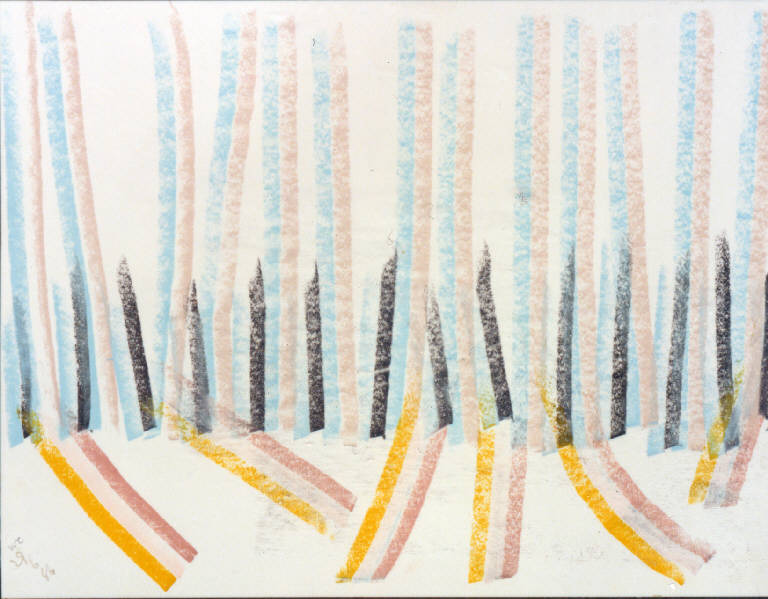 - NOTIZIE STORICO CRITICHE Altra variante del paesaggio è data da una serie di pastelli in cui l'immagine viene descritta mediante una cortina di segni paralleli o quasi, organizzati di volta in volta secondo un'economia differente: ora i segni si fanno più radi e lasciano spazio al fondo e al suo colore, che diventa un elemento più evidentemente costitutivo dell'immagine, ora i segni si fanno più fitti, fino quasi a nascondere il fondo lasciandone intravedere solo alcune linee sottili. C'è anche una differenza ritmica all'interno dell'utilizzo dei segni stessi: una più rigorosa data dall'utilizzo esclusivo di linee parallele, l'altra invece più "melodica" data dall'utilizzo di segni più brevi e ondulati. Di norma in tutti questi casi il paesaggio è dato dal dialogo fra i due elementi costitutivi cielo e terra o dal monologo di uno solo di questi elementi.