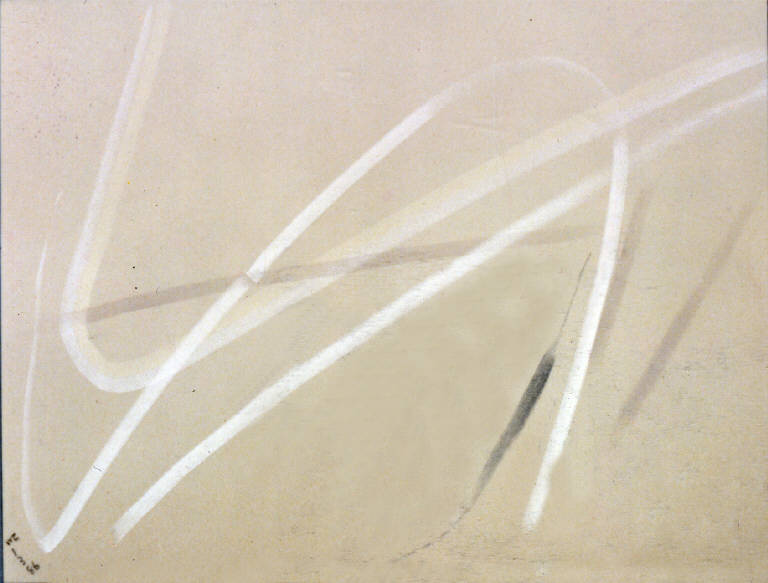 - NOTIZIE STORICO CRITICHE L'osservazione inesausta e quotidiana del paesaggio antistante lo studio trova nei pastelli, rispetto alla pittura, una via rappresentativa del tutto particolare. Gli elementi del paesaggio vengono infatti ridotti all'estremo fino a portare la composizione ad un'apparente astrazione. Tuttavia è possibile riconoscere quegli stessi elementi che caratterizzano i paesaggio della Bassa milanese anche più descrittivi: cielo, terra, canale e filare di alberi. Questi elementi chiave vengono riassunti in un solo segno che diventa la traccia luminosa di ciò che rappresenta. Il resto della composizione, il senso spaziale e atmosferico della stessa, è affidato al colore del supporto stesso che viene ravvivato dai segni ortogonali, curvi o obliqui che lo percorrono.