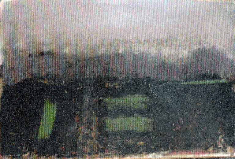 - NOTIZIE STORICO CRITICHE Congdon affianca alla produzione dei dipinti le prime opere a pastello all'inizio degli anni Ottanta. Le prime prove, come in questo caso, risentono ancora di una visione di tipo naturalistico: il paesaggio rurale, che egli osserva della finestra del suo studio alla Cascinazza come tra le montagne di Subiaco, viene restituito in maniera sintetica e allo stesso tempo estremamente narrativa. Compaiono una serie di elementi che rimangono come imprescindibili punti di riferimento: il campo che si incunea verso al linea dell'orizzonte, il filare di alberi che separa la terra dal cielo e il segno scuro del canale sulla destra che fiancheggia il campo, la montagna che chiude la vista della valle dell'Aniene.