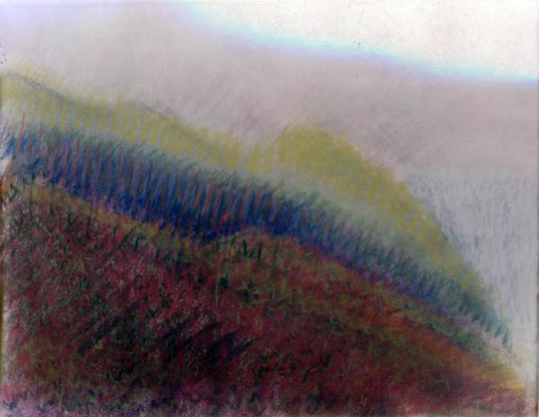 - NOTIZIE STORICO CRITICHE Congdon affianca alla produzione dei dipinti le prime opere a pastello all'inizio degli anni Ottanta. Le prime prove, come in questo caso, risentono ancora di una visione di tipo naturalistico: il paesaggio rurale, che egli osserva della finestra del suo studio alla Cascinazza come tra le montagne di Subiaco, viene restituito in maniera sintetica e allo stesso tempo estremamente narrativa. Compaiono una serie di elementi che rimangono come imprescindibili punti di riferimento: il campo che si incunea verso al linea dell'orizzonte, il filare di alberi che separa la terra dal cielo e il segno scuro del canale sulla destra che fiancheggia il campo, la montagna che chiude la vista della valle dell'Aniene.