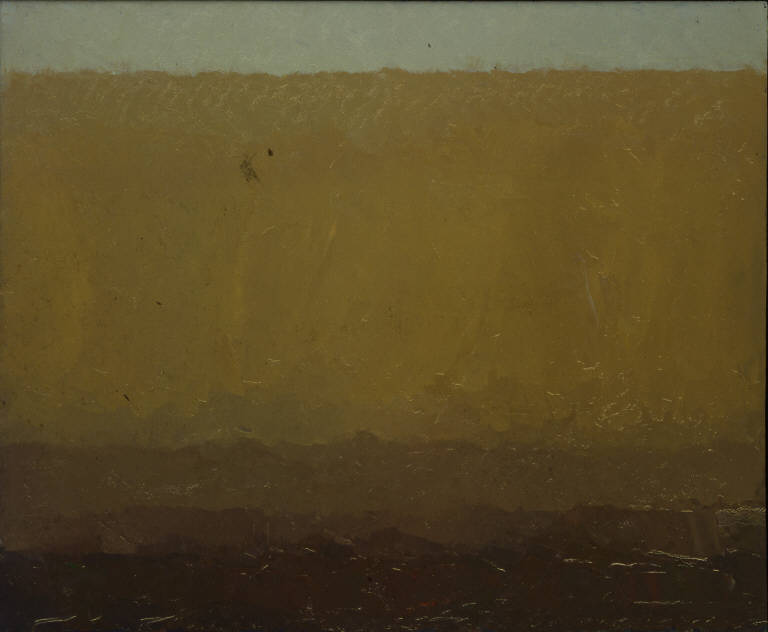 - NOTIZIE STORICO CRITICHE Congdon fissa gli elementi essenziali del dipinto: lo sfondo sostanzialmente monocromo, di tonalità cangiante giallo-arancione-beige, modellato da poche ma dense spatolate. Il tratto di maggior rilievo di opere di questo tipo è nella capacità di saldare la ricerca sul colore-luce con quella monumentale plasticità che, sin dagli esordi, accompagna il percorso dell'artista.