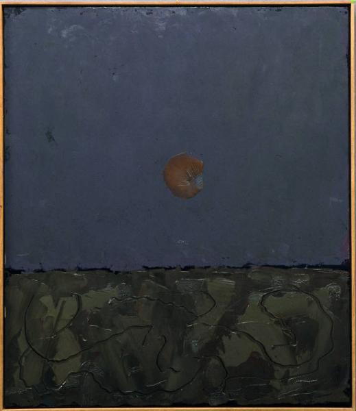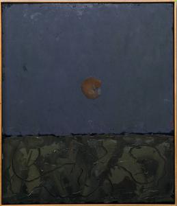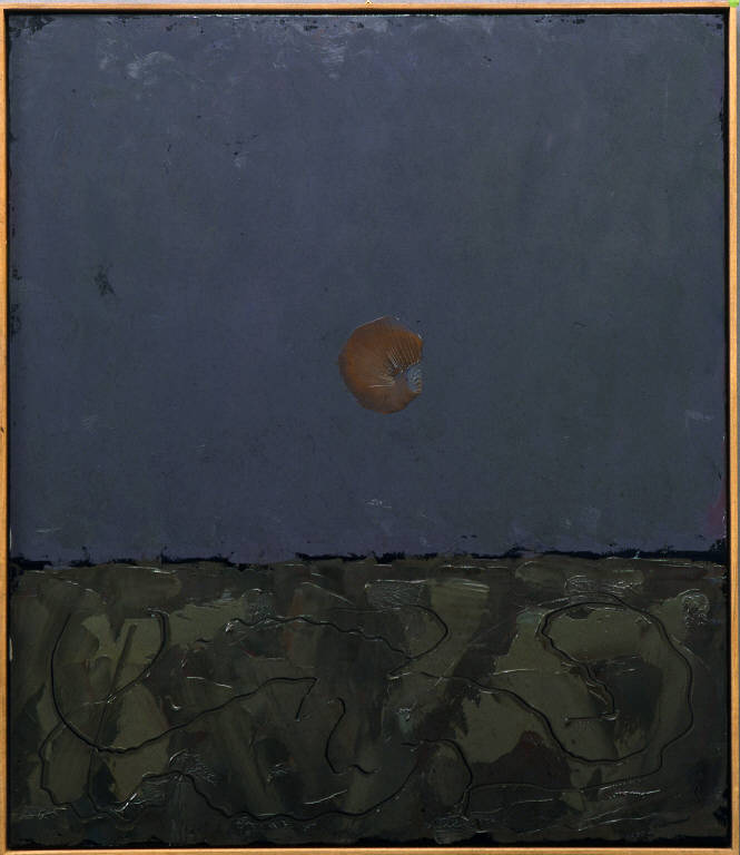 - NOTIZIE STORICO CRITICHE Il dipinto presenta una delle pià tipiche composizioni congdoniane, lo spazio diviso in due tra terra e cielo e il disco lunare al centro. Nella composizione tutto è affidato ai rapporti cromatici e ritmici nella suddivisione dello spazio. In questo caso la terra ha una gamma di colori autunnali sul verde marrone ed è percorsa da un unico tremolante segno di punteruolo. Nel cielo grigio spicca una luna insolitamente rossa, realizzata con un unico segno circolare della spatola.