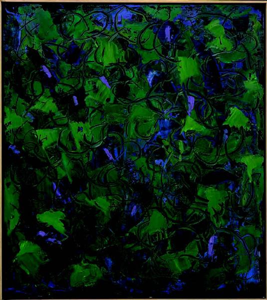 - NOTIZIE STORICO CRITICHE Nella primavera dell'89 Congdon torna al motivo floreale con Glicine e Violette. Rispetto all'archetipo dell'83 l'attenzione dell'artista privilegia ora alla precedente essenzialità un più rigoroso e affollato tessuto, secondo il più volte ricorrente assetto della composizione all-over, nonchè una ricerca sulle intime virtualità del nero del pannello. Il tema si presta infatti a una classica composizione all-over, in cui il panello viene uniformemente ricoperto di macchie di colore e percorso da preziose calligrafie incise nel pigmento con la punta della spatola. Il tessuto dell'opera è ulteriormente arricchito dai vuoti che lasciano trasparire il fondo nero.