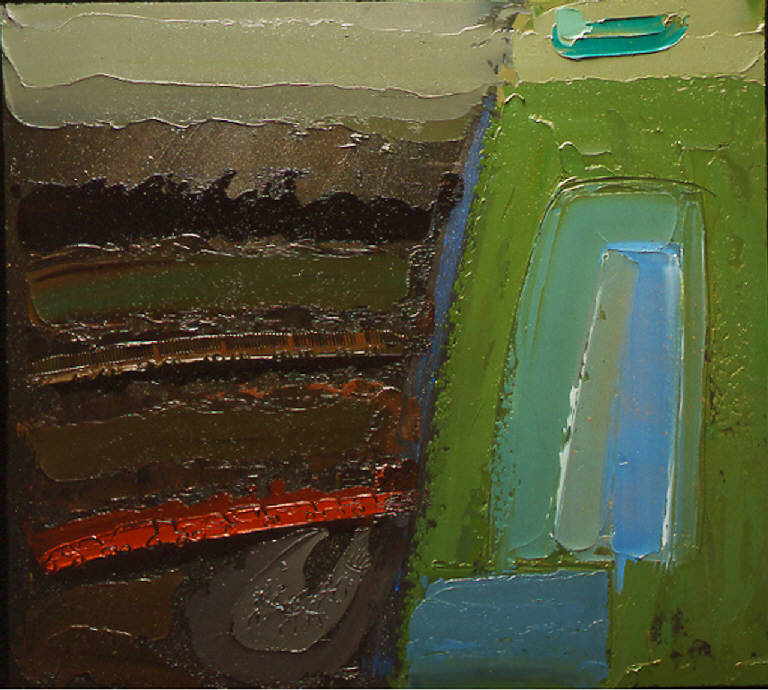 - NOTIZIE STORICO CRITICHE Abidjan, 5 è parte di una breve serie di vedute della città di Abidjan, excapitale della Costa d'Avorio, uno degli ultimi viaggi compiuti da Congdon. In queste opere l'artista descrive, anche ironicamente, l'aspetto più turistico del luogo identificato nella parte destra del dipinto con la visione aerea della piscina, mentre un gruppo, forse di gitanti, si muove compatto attraversando una piazza. L'ironia del dipinto si stempera invece sul lato sinistro dove la costruzione a spatolate intrecciate richiama invece la stazione di Calcutta e soprattutto le vedute più tragiche delle strade di Bomay. La sezione sinistra è divisa in tre parti dalle due vie di comunicazione, sotto le piccole macchine rosse disegnate col punteruolo in una pittura particolarmente materica, sopra più mimetizzata con lo sfondo la ferrovia occupata da una serie di vagoni. Rispetto al numero 4 della serie l'opera risulta più geometricamente rigorosa e sintetica.