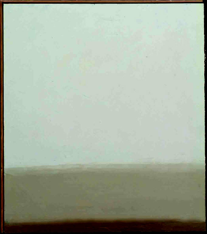 - NOTIZIE STORICO CRITICHE All'inizio del 1983 Congdon aveva annotato nel suo diario: "La Grazia della nebbia è stato nel suo essere nuova base - ne nero ne bianco - ma base già colore o corpo dell'immaginazione non più un fondo da coprire ma un fondo da usare come massa della composizione". Colpiscono in quest'opera la muta densità del fondo - in cui non compaiono tracce del nero sottostante - e i delicati trapassi tonali, dalla terra con la sua pittura ancora corposa all'etereità del bianco perlaceo del cielo. La riduzione dell'immagine al gioco musicale di puri valori tonali trova quindi sempre la propria motivazione in un dato naturalistico, la sezione orizzontale di terra e cielo.