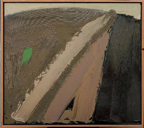 - NOTIZIE STORICO CRITICHE Il febbraio del 1981 è interamente occupato dall'importante serie dei Terra arida. In queste opere le tinte sono piuttosto spente e cineree, al limite del monocromo; viene invece esaltato il contrasto chiaro-scuro, che tende a tagliare il dipinto in due zone nettamente contrapposte come in certe vedute italiane degli anni '50. "L'aridità della terra mi diventa soggetto - arbitrario comporre i campi sabbiosi, gessosi, cenorosi [scil. cinerei] con un cuore di verde marcito. Orizzonte curvo = universale. Cielo luce ma senza luce". La nota diaristica del 19 febbraio 1981 è il fedele verbale con cui Congdon registra la nascita di Terra Arida, 1, la prima della serie. Il lavoro della spatola è più libero e gestuale rispetto alle versioni successive, ma già è fissato l'impianto generale di queste: la divisione in due zone, nera carbone a sinistra e una varia combinazione di beige e grigio violetto a destra; l'uso del pettine a creare la regolare testura di solchi; la macchia di verde tenero che diventa il cuore cromatico e luminoso del dipinto. L' energica spatolata biancastra al centro è viceversa l'asse attorno al quale si articola tutta la composizione. La curvatura dell'orizzonte conferisce effettivamente al dipinto un senso di dilatazione spaziale quasi "cosmico".