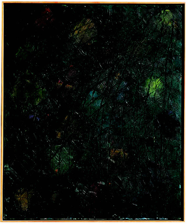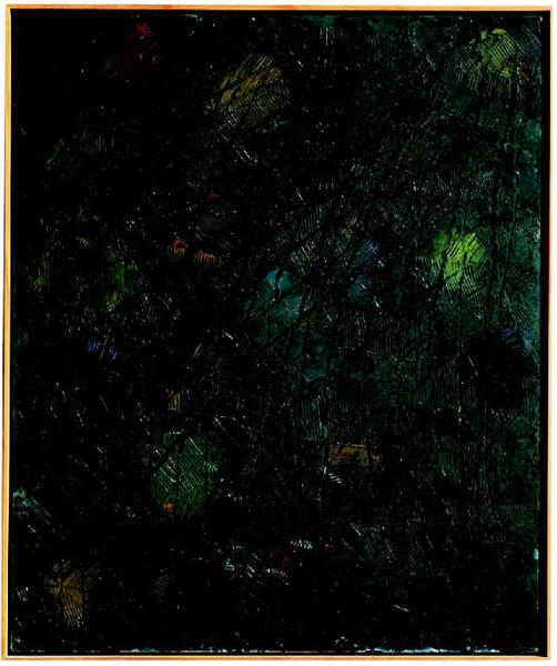 - NOTIZIE STORICO CRITICHE "Pioggia su nero", che si può accostare a opere come "Violette", presenta una composizione "all over", per cui il pannello nero viene coperto in modo uniforme da macchie di colore bruno e verde che a tratti si accendono di barlumi di luce, grazie anche agli effetti di "texture" prodotti dal pettine. Un ulteriore intervento grafico, con il manico della spatola o del pennello, si sovrappone al tutto con la caratterista conformazione a rete che usualmente Congdon associa al fenomeno della pioggia. Ma è proprio tale metallico, nervoso e quasi inestetico graticcio, insieme al drammatico contrasto di luce e ombra, a impedire che la ricchezza del tessuto del dipinto scada nel decorativo.