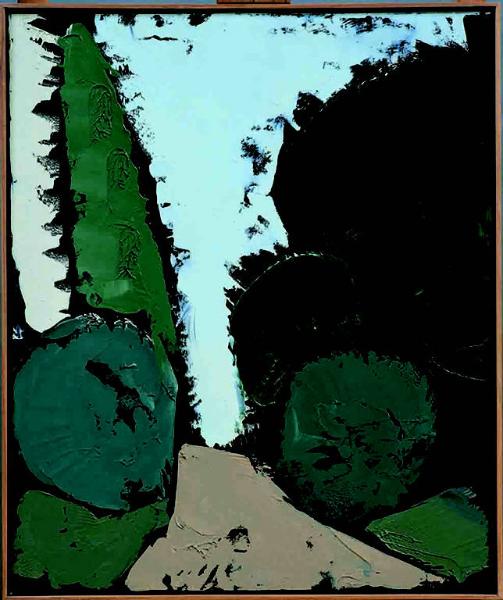 - NOTIZIE STORICO CRITICHE Il ritorno a una figurazione più esplicita e quasi disarmante nella sua naïveté è percepibile a mano a mano che ci si inoltra negli anni '90. Non è casuale che vi ricorra in modo sempre più insistente il motivo dell'albero, già emerso sporadicamente negli anni precedenti. Si tratta di un soggetto, del resto, ricco di suggestioni simboliche e letterarie, facilmente associabile al tema della croce o alla figura umana. La forma, raffigurata isolatamente o in gruppo, è risolta in termini robustamente plastici, talvolta decisamente scultorei, come si vede in Pioppo del 1993. Alla forma solitaria e rigonfia di quest'ultimo si contrappone il sottile obelisco obliquo de Il pioppo del 1992, messa in contrasto con le forme tondeggianti della circostante vegetazione.