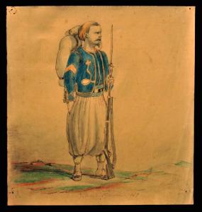 Zuavo francese. Uno zuavo completamente equipaggiato appoggiato alla baionetta