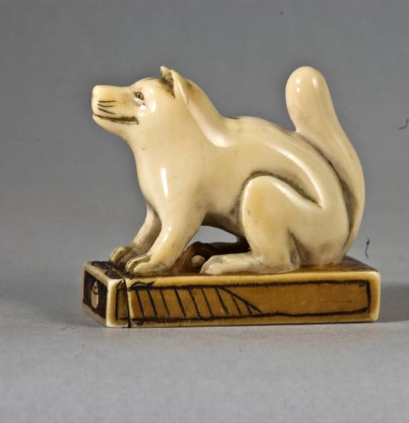 Questo netsuke-okimono raffigura una volpe bianca (kitsune) seduta su un plinto rettangolare decorato sul davanti con una perla (tama).