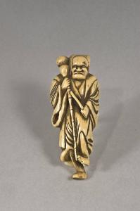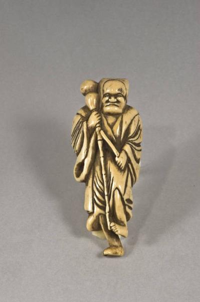 Netsuke raffigurante un uomo stante con copricapo a cuffia; la gamba sinistra è sollevata, nella mano destra tiene un bastone sulla punta del quale è inserita la bocca di una fiasca a zucca (hyotan). Sul retro, al centro, è presente un unico foro.