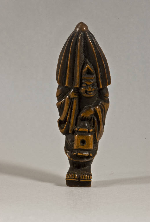Il netsuke raffigura un guardiano di tempio: indossa un copricapo eboshi e tiene nella mano sinistra una lanterna in bronzo con la quale illumina la strada mentre perlustra di notte e sotto la pioggia, riparato da un ampio ombrello, l'area recintata del tempio; ai piedi indossa i sandali geta. Sul retro è presente un unico foro.