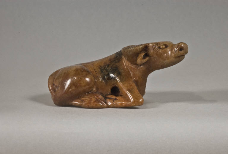 Netsuke raffigurante un bue (ushi) sdraiato. I due fori dell'himotoshi, uno di dimensioni maggiori rispetto all'altro, si trovano sul ventre dell'animale.