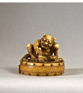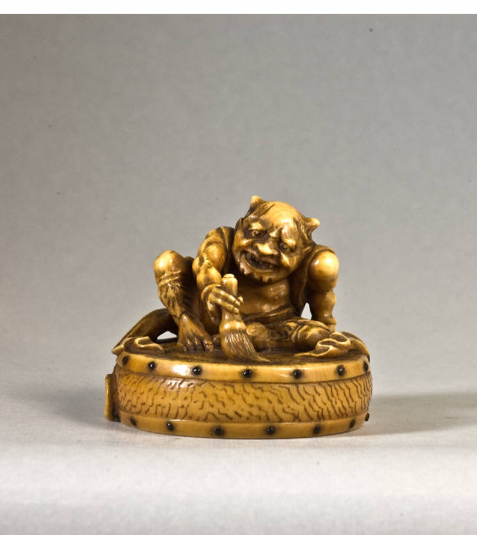 La composizione di questo netsuke mostra una figura di aspetto demoniaco seduta su un grande tamburo, mentre con la mano destra usa un pennello di setole per dipingere (o pulire) lo strumento musicale. Gli umboni del tamburo, decorato sulle due facce con il motivo delle "tre virgole" (mitsu tomoe), sono intarsi di corno.