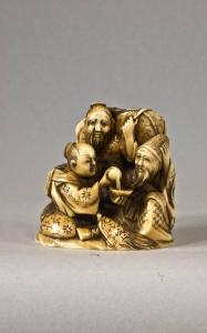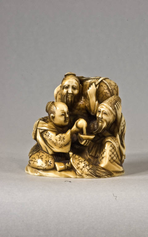 Netsuke-okimono raffigurante una scena con tre personaggi, uno in piedi e due seduti, tra i quali si inserisce una tartaruga millenaria (minogame): uno degli uomini versa da una borraccia a zucca del vino in una ciotola tenuta da un'altra figura; la terza, posta dietro i due, osserva la scena, appesantito da una grossa sacca tenuta sulle spalle.