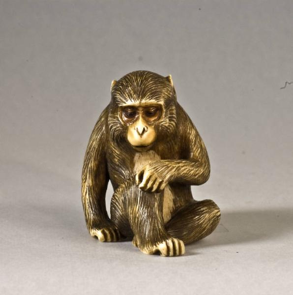 Netsuke raffigurante una scimmia (saru) seduta, intenta a grattarsi il ginocchio destro con la mano sinistra. I due fori dell'himotoshi, disposti in orizzontale, si trovano sul retro dell'animale, all'altezza della zona superiore del bacino.