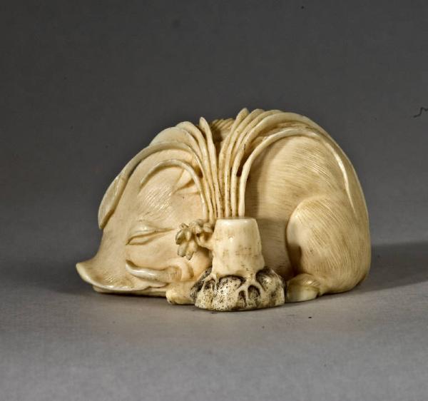 Okimono raffigurante un cinghiale (inoshishi) placidamente addormentato tra le erbe autunnali.