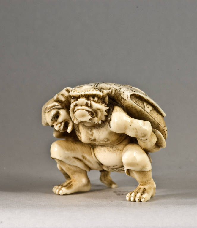 Netsuke raffigurante un oni piegato sulle proprie gambe dal peso di una borsa da tabacco (tonkotsu) decorata con una maschera di demone (oni) in rilievo e una fenice (hoo) in volo tra nuvole, completa di ojime sferico e katabori netsuke con una maschera di Hannya; nell'impresa di sollevare il grande peso è aiutato da un oni più piccolo che gli sta sul fianco destro. I due fori dell'himotoshi si trovano sul retro, all'altezza del bacino: uno dei due ha dimensioni maggiori rispetto all'altro.