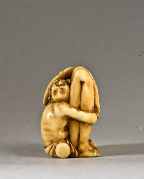 - NOTIZIE STORICO CRITICHE Il modello per questo tipo di composizione, abbastanza inusuale nell'ambito della raffigurazione di Tenaga e Ashinaga, potrebbe essere stato messo a punto da Yamaguchi Chikuyosai Tomochika (1800-1873), attivo a Edo a partire dal 1830 circa, fondatore e guida di una grande bottega nella quale si realizzavano netsuke con soggetti tratti dalla storia cinese e giapponese e dalla vita quotidiana. Secondo Ueda (1961, ad vocem), uno dei temi prediletti dai Tomochika era proprio quello di Tenaga e Ashinaga, spesso ispirato alle immagini di analogo tema contenute nei Manga di Katsushika Hokusai (1760-1849). Un'analoga composizione caratterizza un pezzo pubblicato in Eskenazi 1998, n. 16.