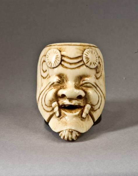 Netsuke raffigurante una maschera di Okina, caratterizzata dalla presenza di pizzetto, ciuffi di capelli sulla fronte e un'espressione sorridente. Agli angoli della bocca è simulata la presenza dei ganci che uniscono le due sezioni di cui si compone la maschera usata da questo personaggio negli spettacoli reali.