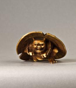 Okimono raffigurante un oni che tiene nella mani il laccio di un cappello di paglia, grazie al quale si ripara dal tradizionale lancio di fagioli secchi della notte di Capodanno, nel rito benaugurate dell'Oniyarai ("Via i demoni").