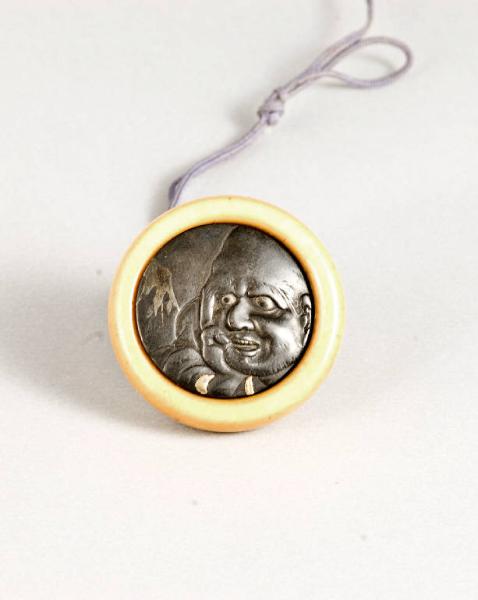 Netsuke di tipo kagamibuta con cornice in avorio e piastra in metallo parzialmente dorato. Su quest'ultima è raffigurata una composizione in rilievo con una testa di rakan; si vede anche parte del braccio e la mano destra posata sulla guancia.