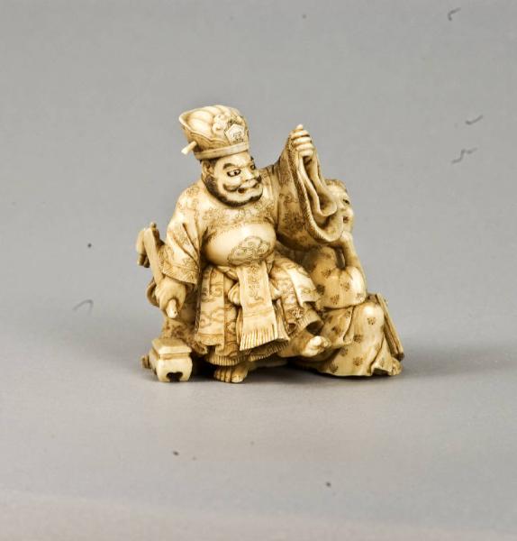 Okimono raffigurante Enmao insieme a due assistenti; quella al suo fianco sorregge tra le mani un libro, mentre la donna-oni alle sue spalle sta seduta suonando con il plettro lo shamisen. La decorazione degli abiti dei tre personaggi di questa composizione è ricca, di motivi floreali e geometrici per certi versi ispirati al repertorio cinese. Nella parte anteriore del copricapo della divinità è inciso l'ideogramma o, "re".