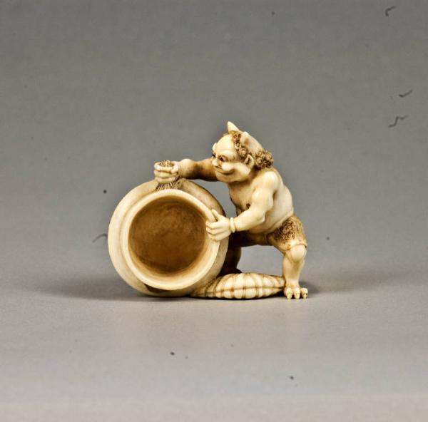 - NOTIZIE STORICO CRITICHE L'opera può essere attribuita ad uno dei tre artisti conosciuti che firmarono con questo nome (Ueda 1961, p. 236, nn. 336-338): Saito Ikkosai (1804-1876) di Osaka, il figlio Yataro (1833-1893, noto anche come Kojitsu e attivo a Edo) e Ikkosai Toun (attivo a Edo tra il 1840 e il 1870 circa); proprio quest'ultimo sembra fosse specializzato nella realizzazione di netsuke con oni (Brockhaus 1905, ed. 2005, p. 168; Jonas 1928, p. 135; Davey 1974, pp. 132-133, nn. 389-393). La collezione Baur di Ginevra conserva quindici netsuke sui quali è riportata la firma Ikkosai (Coullery - Newstead 1977, nn. C60, C144, C146, C169, C205, C220, C221, C394, C534, C538, C582, C623, C645, C681, C979): la specificazione Kojitsu è riferita solo ad una serie di manju; per il resto si tratta invece di figure in katabori, spesso divinità e creature fantastiche. Per un altro netsuke firmato Ikkosai e attribuito a Toun si veda il n. inv. 5676.