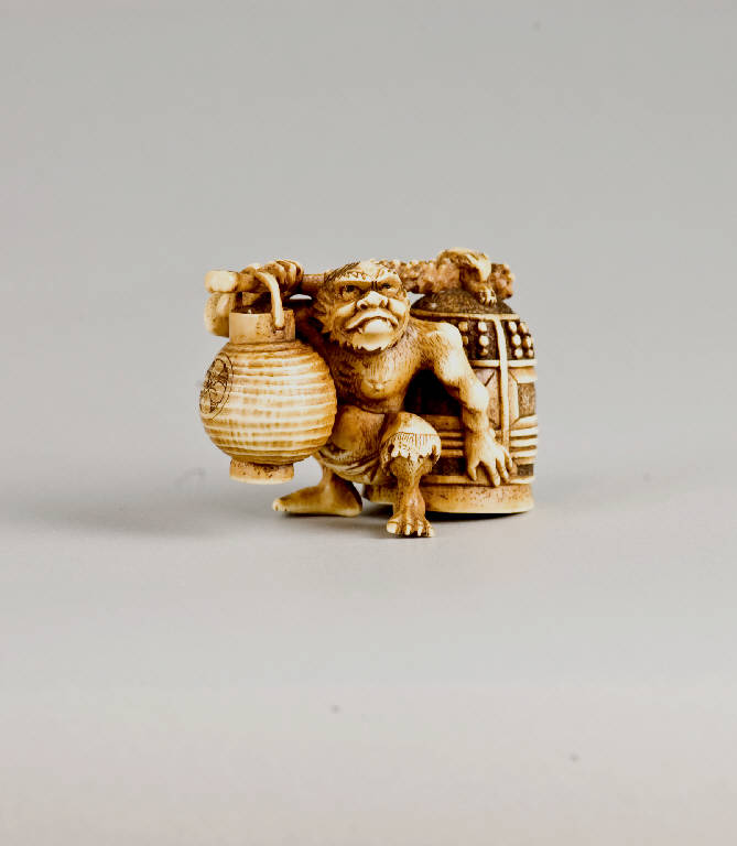Okimono raffigurante un oni vestito del solo perizoma; utilizzando il suo lungo bastone come pertica, trasporta da un lato una grande campana in bronzo da tempio (densho) con presa a forma di testa di drago, e dall'altro una lampada di carta.
