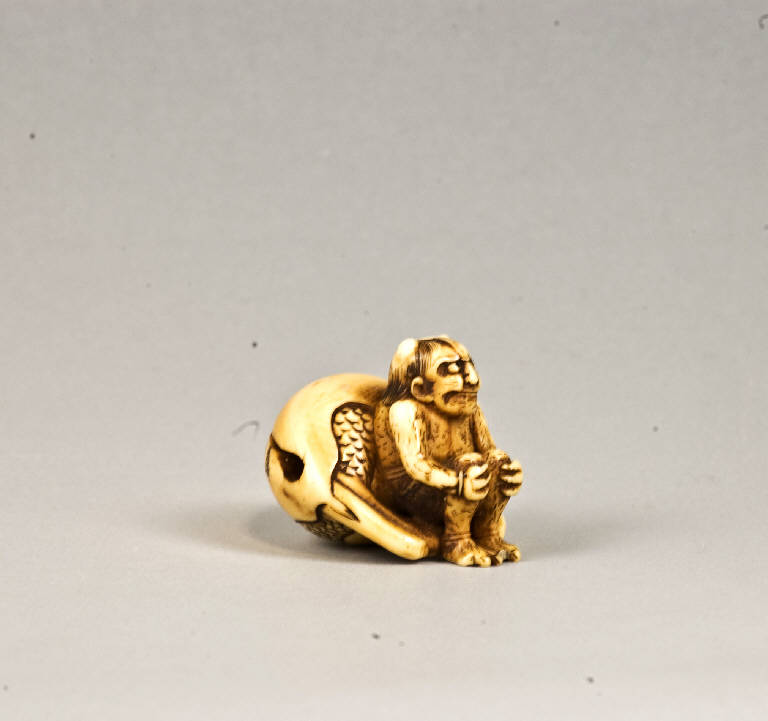 Netsuke raffigurante un oni seduto su un tamburo rituale mokugyo; il demone tiene tra le mani le ginocchia sollevate. I due fori dell'himotoshi si trovano sul lato inferiore del mokugyo.