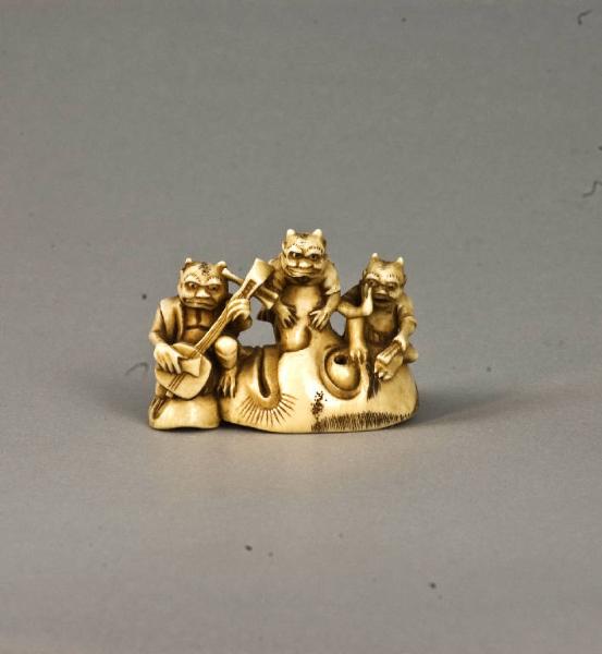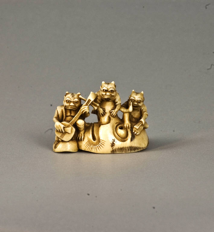 La composizione raffigura tre oni (uno dei quali intento a suonare lo shamisen) seduti su una maschera caratterizzata da un naso alquanto pronunciato.