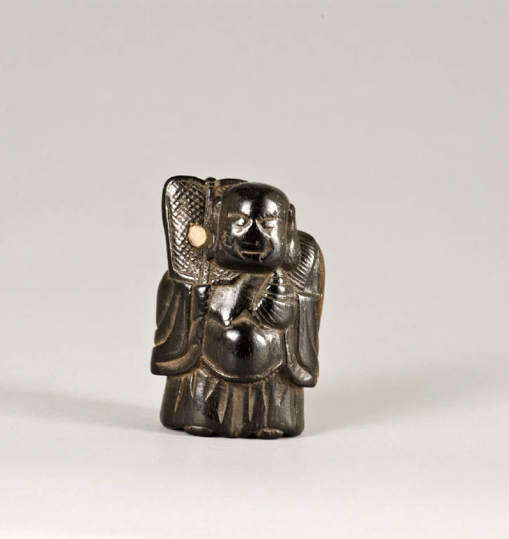 Netsuke raffigurante Hotei in piedi, vestito di un abito che lascia scoperto il petto e il ventre prominente; nella mano destra tiene un ventaglio rigido (uchiwa).