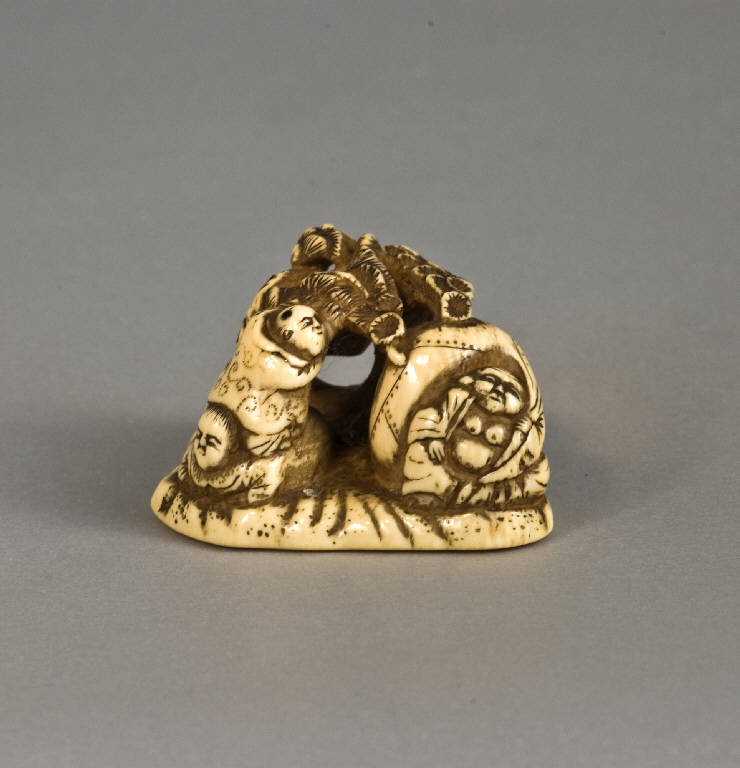 Composizione raffigurante un lembo di terra quasi del tutto coperto dai rami di un frondoso albero di pino (matsu); sulla destra sta seduto Hotei, poggiato sul suo grande sacco, spiato da due "bambini cinesi" (karako) che per meglio osservarlo si sono sistemati uno sulle spalle dell'altro.