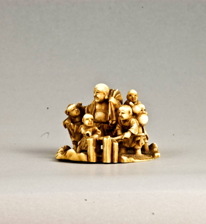 La composizione di questo netsuke-okimono mostra Hotei con la sacca sulle spalle attorniato da cinque karako intenti ad attraversare un corso d'acqua; la divinità si sorregge in parte posando la mano destra sulla spalla di uno dei bambini; mentre uno di questi ultimi ne porta in groppa un altro, gli altri tre, due dei quali si aiutano nella traversata tenendosi l'uno con l'altro grazie ad un bastone, trasportano alcuni oggetti che si possono associare al dio come suoi attributi: una fiasca a zucca (hyotan), un ventaglio (uchiwa) e un rotolo dipinto (emakimono).