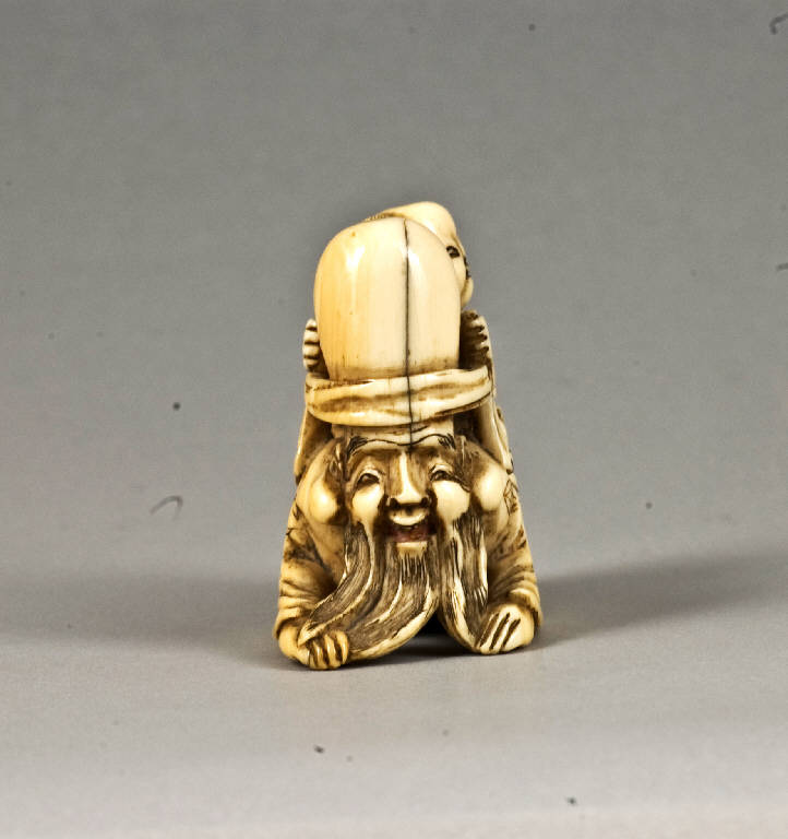 Netsuke raffigurante Fukurokuju carponi; sulle sue spalle un "bambino cinese" (karako) lo cavalca tenendo tra le mani a mo' di redini un fazzoletto con il quale cinge il grande cranio della divinità. I due fori dell'himotoshi sono ubicati sul lato inferiore, in corrispondenza della pancia di Fukurokuju.