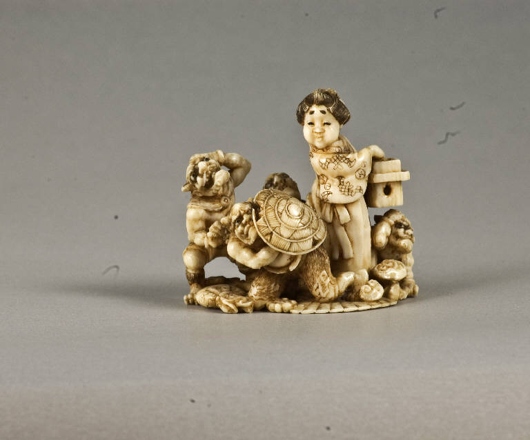 - NOTIZIE STORICO CRITICHE Il Davey (1974, p. 462, n. 448) riconduce questa firma ad un netsukeshi attivo nel tardo XIX secolo, specializzato nella realizzazione di composizioni con figure molto elaborate in avorio. Per un altro netsuke realizzato da questo stesso artista v. inv. n. 5499. Disegnato dal Meinertzhagen, che nello scheda così lo descrive: "ivory-group. Okamé performing the New Year's ceremony or "oni-yarai" by scattering dried beans over four struggling "onis". Sig. Gioku-shu [sic!] (very cleverly carved group with a deal of careful detail trhowing a good deal of spirit: but to the traines eye misses really fine workmanship and artistry feeling: early Meiji work, made fo the foreign market but neverthless duplasis unusual merit in its class. Of same school as shugioku [sic!]". Il Meinertzhagen conosceva almeno altri due opere di questo artista (MCI 1986, I, p. 105).