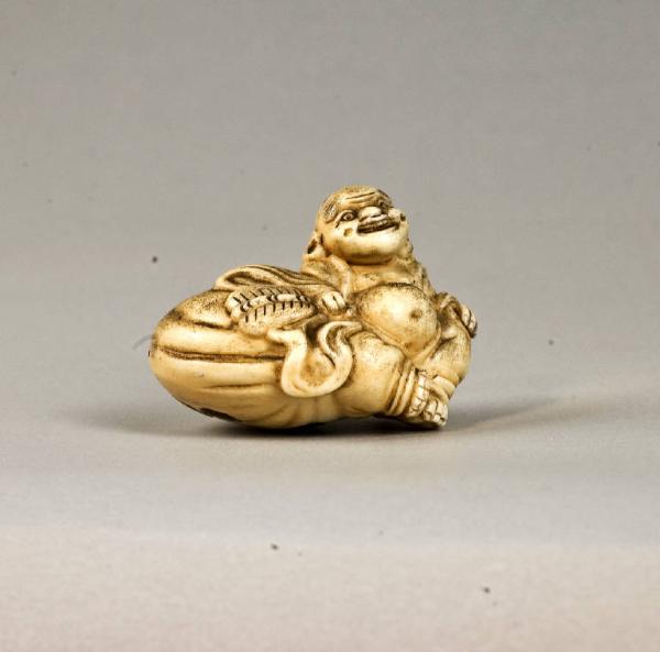 Netsuke raffigurante una composizione con Okame che da una bottiglia versa del sake a Shoki seduto; quest'ultimo le palpeggia il fondoschiena, mentre un piccolo oni, in piedi sul lato sinistro di Okame, approfitta del momento per appropriarsi di un oggetto.