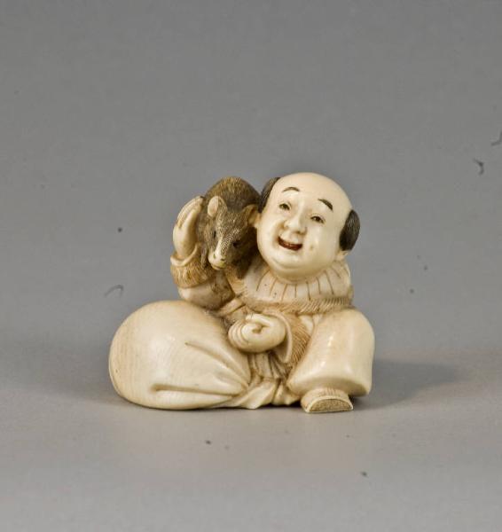 La composizione raffigura un "bambino cinese" (karako) seduto, con un grande sacco al fianco e un topo sulle spalle. L'avorio è inciso e dipinto a inchiostro nero, mentre la bocca del bambino è evidenziata da inchiostro rosso; gli occhi del topo sono intarsi di corno traslucido.
