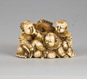Netsuke-okimono raffigurante quattro "bambini cinesi" (karako): due di loro giocano a spintonarsi, un terzo ha infilato nel braccio destro una testa di cavallo a dondolo, mentre il quarto tiene con la mano sinistra una maschera raffigurante Okame. Tutti sono vestiti di ampli abiti 'alla cinese' caratterizzati dalla presenza di vistosi collari sfrangiati; le acconciature si compongono di ciuffi di capelli sul davanti, sui lati e sul retro della testa altrimenti rasata.
