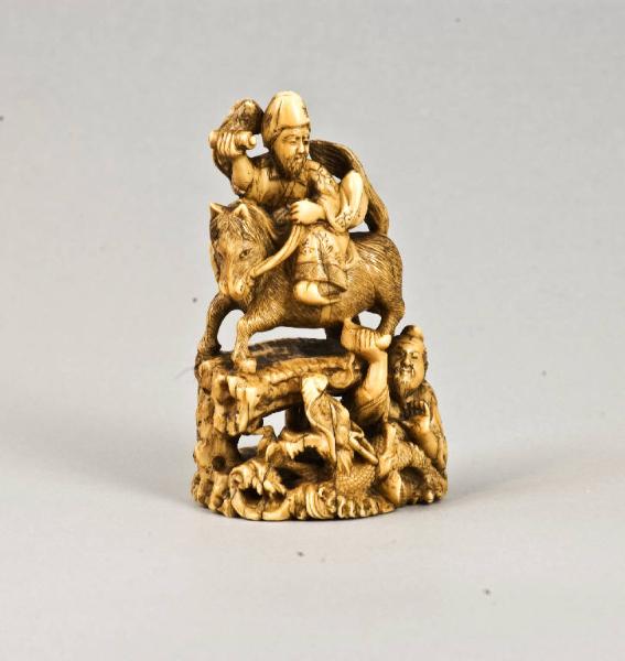 Okimono raffigurante una scena abbastanza complessa, nella quale si vede Kosekiko in groppa ad un cavallo mentre attraversa un ponte; con la mano sinistra trattiene le redini dell'animale, mentre con quella destra, sollevata in alto, mostra un rotolo manoscritto; ai suoi piedi, per metà immerso nell'acqua e noncurante del drago che gli sta accanto, Choryo ha in mano una scarpa.