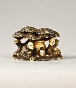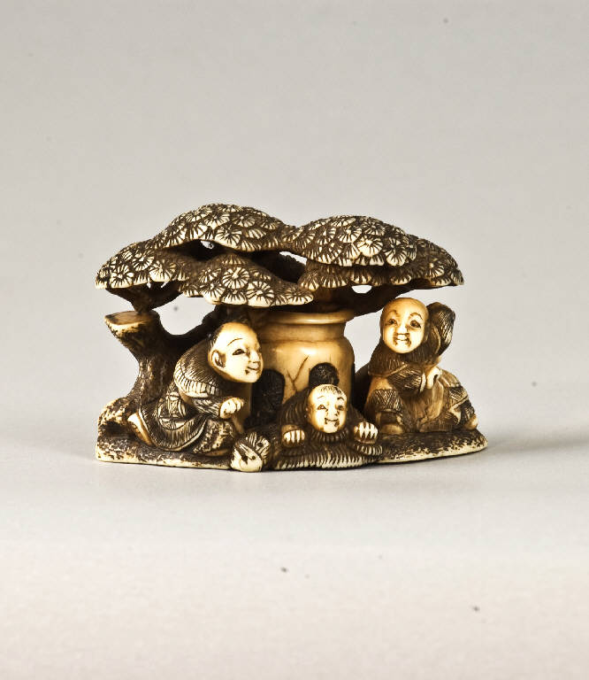 Netsuke-okimono raffigurante una scena, sovrastata da un grande albero di pino (matsu), con quattro "bambini cinesi" (karako) nei pressi di un vaso rotto, posto al centro della composizione; uno dei bambini è in procinto di fuoriuscire dall'orcio, alla destra del quale, in piedi, sta un altro karako con in mano una pietra; gli altri due bambini osservano con attenzione l'evolversi degli avvenimenti.
