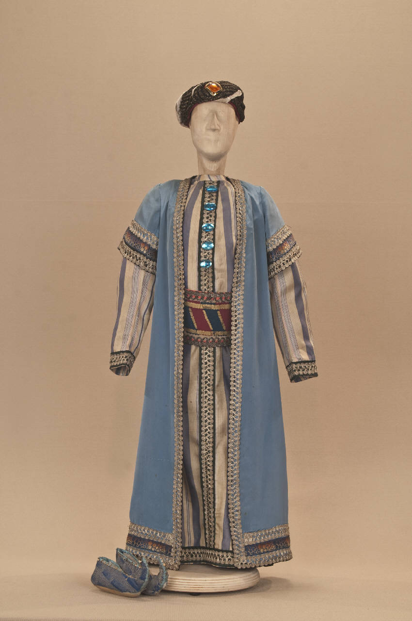Costume di foggia indiana di epoca romana realizzato per il Re Magio Melchiorre composto da veste, sopravveste, cintura e scarpe. Il cappello che completa il costume ha il codice C 08473.