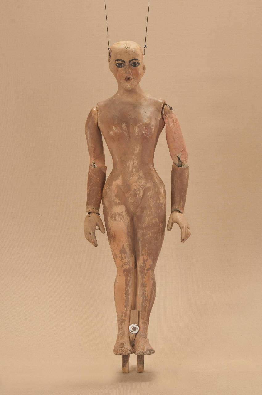 Testa, corpo e braccia in cartapesta, mani in legno di tiglio scolpito con dita unite, braccia e mani snodate collegate con incastri ed elastico. Presenza di un anello (forchinella) nelle labbra.