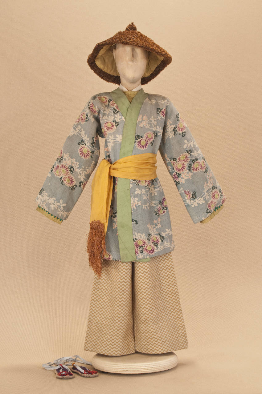 Costume da popolano giapponese composto da giacca, pantaloni, corpino, collo, fascia e sandali. Si completa con un cappello che ha il codice C 08225.