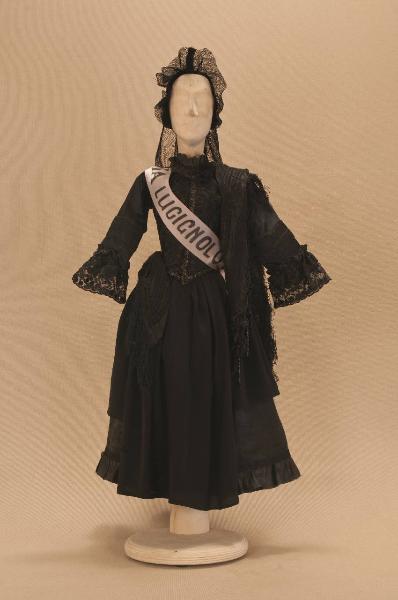 Costume da donna spagnola composto da veste, cuffia, scialle e fascia