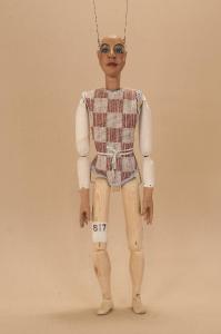 Testa in legno di tiglio fissata al corpo tramite ferro; occhi di vetro; corpo normale in abete; gambe attaccate con ferro al bacino; ginocchia ad incastro; piedi piombati; mani in tiglio fisse con dita scolpite e separate. Bilancino originale per coppie metodo Holden.