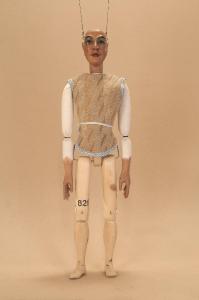 Testa in legno di tiglio fissata al corpo tramite ferro; occhi di vetro; corpo normale in abete; gambe attaccate con ferro al bacino; ginocchia ad incastro; piedi piombati; mani in tiglio fisse con dita scolpite e separate. Bilancino originale per coppie metodo Holden.