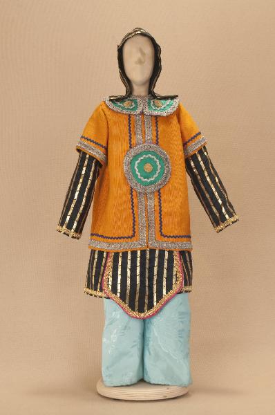 - NOTIZIE STORICO CRITICHE Si completa con elmo e scarpe. Il costume è stato realizzato per "La Lampada di Aladino", uno spettacolo che nasce come riduzione teatrale per marionette nel 1994. L¿argomento è tratto dalla fiaba "Aladino e la lampada meravigliosa", appendice della raccolta "Le Mille e Una Notte". Lo spettacolo di Eugenio Monti Colla, andato in scena in prima mondiale al Festival di Spoleto con musiche di Danilo Lorenzini, snoda il racconto in tredici quadri di ambientazione cinese come indicato nella fiaba d¿origine e narra l¿evoluzione del protagonista da giovinetto a uomo maturo attraverso vicende di carattere fantastico e simbolico.